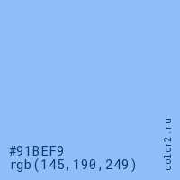 Цвет #91BEF9 в цветовой модели RGB обозначается тремя октетами (145, 190, 249) в десятичном формате и #91BEF9 в шестнадцатиричном (hex) формате, которые являются интенсивностью красного 145 (hex 91), интенсивность зелёного 190 (hex BE) и интенсивность синего 249 (hex F9).