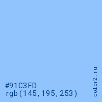 Цвет #91C3FD в цветовой модели RGB обозначается тремя октетами (145, 195, 253) в десятичном формате и #91C3FD в шестнадцатиричном (hex) формате, которые являются интенсивностью красного 145 (hex 91), интенсивность зелёного 195 (hex C3) и интенсивность синего 253 (hex FD).