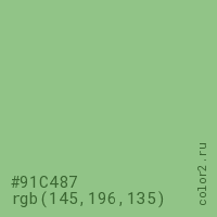 Цвет #91C487 в цветовой модели RGB обозначается тремя октетами (145, 196, 135) в десятичном формате и #91C487 в шестнадцатиричном (hex) формате, которые являются интенсивностью красного 145 (hex 91), интенсивность зелёного 196 (hex C4) и интенсивность синего 135 (hex 87).