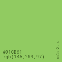 Цвет #91CB61 в цветовой модели RGB обозначается тремя октетами (145, 203, 97) в десятичном формате и #91CB61 в шестнадцатиричном (hex) формате, которые являются интенсивностью красного 145 (hex 91), интенсивность зелёного 203 (hex CB) и интенсивность синего 97 (hex 61).