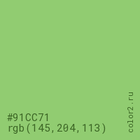 Цвет #91CC71 в цветовой модели RGB обозначается тремя октетами (145, 204, 113) в десятичном формате и #91CC71 в шестнадцатиричном (hex) формате, которые являются интенсивностью красного 145 (hex 91), интенсивность зелёного 204 (hex CC) и интенсивность синего 113 (hex 71).