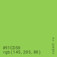 Цвет #91CD50 в цветовой модели RGB обозначается тремя октетами (145, 205, 80) в десятичном формате и #91CD50 в шестнадцатиричном (hex) формате, которые являются интенсивностью красного 145 (hex 91), интенсивность зелёного 205 (hex CD) и интенсивность синего 80 (hex 50).