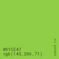 Цвет #91CE47 в цветовой модели RGB обозначается тремя октетами (145, 206, 71) в десятичном формате и #91CE47 в шестнадцатиричном (hex) формате, которые являются интенсивностью красного 145 (hex 91), интенсивность зелёного 206 (hex CE) и интенсивность синего 71 (hex 47).