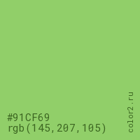 Цвет #91CF69 в цветовой модели RGB обозначается тремя октетами (145, 207, 105) в десятичном формате и #91CF69 в шестнадцатиричном (hex) формате, которые являются интенсивностью красного 145 (hex 91), интенсивность зелёного 207 (hex CF) и интенсивность синего 105 (hex 69).