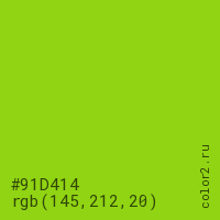 Цвет #91D414 в цветовой модели RGB обозначается тремя октетами (145, 212, 20) в десятичном формате и #91D414 в шестнадцатиричном (hex) формате, которые являются интенсивностью красного 145 (hex 91), интенсивность зелёного 212 (hex D4) и интенсивность синего 20 (hex 14).