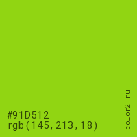 Цвет #91D512 в цветовой модели RGB обозначается тремя октетами (145, 213, 18) в десятичном формате и #91D512 в шестнадцатиричном (hex) формате, которые являются интенсивностью красного 145 (hex 91), интенсивность зелёного 213 (hex D5) и интенсивность синего 18 (hex 12).