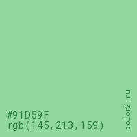 Цвет #91D59F в цветовой модели RGB обозначается тремя октетами (145, 213, 159) в десятичном формате и #91D59F в шестнадцатиричном (hex) формате, которые являются интенсивностью красного 145 (hex 91), интенсивность зелёного 213 (hex D5) и интенсивность синего 159 (hex 9F).