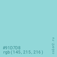 Цвет #91D7D8 в цветовой модели RGB обозначается тремя октетами (145, 215, 216) в десятичном формате и #91D7D8 в шестнадцатиричном (hex) формате, которые являются интенсивностью красного 145 (hex 91), интенсивность зелёного 215 (hex D7) и интенсивность синего 216 (hex D8).