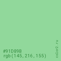 Цвет #91D89B в цветовой модели RGB обозначается тремя октетами (145, 216, 155) в десятичном формате и #91D89B в шестнадцатиричном (hex) формате, которые являются интенсивностью красного 145 (hex 91), интенсивность зелёного 216 (hex D8) и интенсивность синего 155 (hex 9B).
