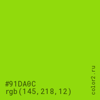 Цвет #91DA0C в цветовой модели RGB обозначается тремя октетами (145, 218, 12) в десятичном формате и #91DA0C в шестнадцатиричном (hex) формате, которые являются интенсивностью красного 145 (hex 91), интенсивность зелёного 218 (hex DA) и интенсивность синего 12 (hex 0C).