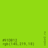 Цвет #91DB12 в цветовой модели RGB обозначается тремя октетами (145, 219, 18) в десятичном формате и #91DB12 в шестнадцатиричном (hex) формате, которые являются интенсивностью красного 145 (hex 91), интенсивность зелёного 219 (hex DB) и интенсивность синего 18 (hex 12).