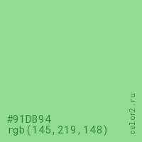 Цвет #91DB94 в цветовой модели RGB обозначается тремя октетами (145, 219, 148) в десятичном формате и #91DB94 в шестнадцатиричном (hex) формате, которые являются интенсивностью красного 145 (hex 91), интенсивность зелёного 219 (hex DB) и интенсивность синего 148 (hex 94).
