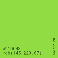 Цвет #91DC43 в цветовой модели RGB обозначается тремя октетами (145, 220, 67) в десятичном формате и #91DC43 в шестнадцатиричном (hex) формате, которые являются интенсивностью красного 145 (hex 91), интенсивность зелёного 220 (hex DC) и интенсивность синего 67 (hex 43).