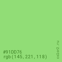 Цвет #91DD76 в цветовой модели RGB обозначается тремя октетами (145, 221, 118) в десятичном формате и #91DD76 в шестнадцатиричном (hex) формате, которые являются интенсивностью красного 145 (hex 91), интенсивность зелёного 221 (hex DD) и интенсивность синего 118 (hex 76).