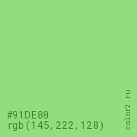Цвет #91DE80 в цветовой модели RGB обозначается тремя октетами (145, 222, 128) в десятичном формате и #91DE80 в шестнадцатиричном (hex) формате, которые являются интенсивностью красного 145 (hex 91), интенсивность зелёного 222 (hex DE) и интенсивность синего 128 (hex 80).