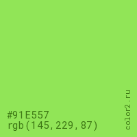 Цвет #91E557 в цветовой модели RGB обозначается тремя октетами (145, 229, 87) в десятичном формате и #91E557 в шестнадцатиричном (hex) формате, которые являются интенсивностью красного 145 (hex 91), интенсивность зелёного 229 (hex E5) и интенсивность синего 87 (hex 57).