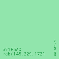 Цвет #91E5AC в цветовой модели RGB обозначается тремя октетами (145, 229, 172) в десятичном формате и #91E5AC в шестнадцатиричном (hex) формате, которые являются интенсивностью красного 145 (hex 91), интенсивность зелёного 229 (hex E5) и интенсивность синего 172 (hex AC).