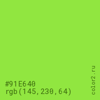 Цвет #91E640 в цветовой модели RGB обозначается тремя октетами (145, 230, 64) в десятичном формате и #91E640 в шестнадцатиричном (hex) формате, которые являются интенсивностью красного 145 (hex 91), интенсивность зелёного 230 (hex E6) и интенсивность синего 64 (hex 40).