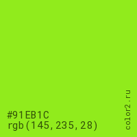 Цвет #91EB1C в цветовой модели RGB обозначается тремя октетами (145, 235, 28) в десятичном формате и #91EB1C в шестнадцатиричном (hex) формате, которые являются интенсивностью красного 145 (hex 91), интенсивность зелёного 235 (hex EB) и интенсивность синего 28 (hex 1C).