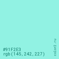 Цвет #91F2E3 в цветовой модели RGB обозначается тремя октетами (145, 242, 227) в десятичном формате и #91F2E3 в шестнадцатиричном (hex) формате, которые являются интенсивностью красного 145 (hex 91), интенсивность зелёного 242 (hex F2) и интенсивность синего 227 (hex E3).