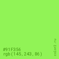 Цвет #91F356 в цветовой модели RGB обозначается тремя октетами (145, 243, 86) в десятичном формате и #91F356 в шестнадцатиричном (hex) формате, которые являются интенсивностью красного 145 (hex 91), интенсивность зелёного 243 (hex F3) и интенсивность синего 86 (hex 56).