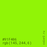 Цвет #91F406 в цветовой модели RGB обозначается тремя октетами (145, 244, 6) в десятичном формате и #91F406 в шестнадцатиричном (hex) формате, которые являются интенсивностью красного 145 (hex 91), интенсивность зелёного 244 (hex F4) и интенсивность синего 6 (hex 06).