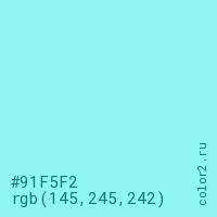 Цвет #91F5F2 в цветовой модели RGB обозначается тремя октетами (145, 245, 242) в десятичном формате и #91F5F2 в шестнадцатиричном (hex) формате, которые являются интенсивностью красного 145 (hex 91), интенсивность зелёного 245 (hex F5) и интенсивность синего 242 (hex F2).