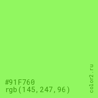 Цвет #91F760 в цветовой модели RGB обозначается тремя октетами (145, 247, 96) в десятичном формате и #91F760 в шестнадцатиричном (hex) формате, которые являются интенсивностью красного 145 (hex 91), интенсивность зелёного 247 (hex F7) и интенсивность синего 96 (hex 60).