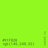 Цвет #91F820 в цветовой модели RGB обозначается тремя октетами (145, 248, 32) в десятичном формате и #91F820 в шестнадцатиричном (hex) формате, которые являются интенсивностью красного 145 (hex 91), интенсивность зелёного 248 (hex F8) и интенсивность синего 32 (hex 20).