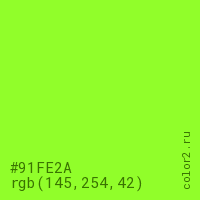 Цвет #91FE2A в цветовой модели RGB обозначается тремя октетами (145, 254, 42) в десятичном формате и #91FE2A в шестнадцатиричном (hex) формате, которые являются интенсивностью красного 145 (hex 91), интенсивность зелёного 254 (hex FE) и интенсивность синего 42 (hex 2A).