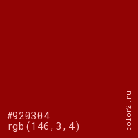 Цвет #920304 в цветовой модели RGB обозначается тремя октетами (146, 3, 4) в десятичном формате и #920304 в шестнадцатиричном (hex) формате, которые являются интенсивностью красного 146 (hex 92), интенсивность зелёного 3 (hex 03) и интенсивность синего 4 (hex 04).
