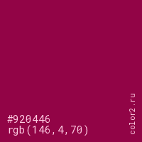 Цвет #920446 в цветовой модели RGB обозначается тремя октетами (146, 4, 70) в десятичном формате и #920446 в шестнадцатиричном (hex) формате, которые являются интенсивностью красного 146 (hex 92), интенсивность зелёного 4 (hex 04) и интенсивность синего 70 (hex 46).