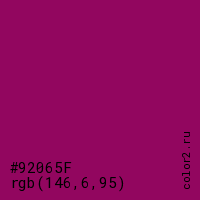 Цвет #92065F в цветовой модели RGB обозначается тремя октетами (146, 6, 95) в десятичном формате и #92065F в шестнадцатиричном (hex) формате, которые являются интенсивностью красного 146 (hex 92), интенсивность зелёного 6 (hex 06) и интенсивность синего 95 (hex 5F).