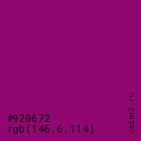 Цвет #920672 в цветовой модели RGB обозначается тремя октетами (146, 6, 114) в десятичном формате и #920672 в шестнадцатиричном (hex) формате, которые являются интенсивностью красного 146 (hex 92), интенсивность зелёного 6 (hex 06) и интенсивность синего 114 (hex 72).