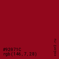 Цвет #92071C в цветовой модели RGB обозначается тремя октетами (146, 7, 28) в десятичном формате и #92071C в шестнадцатиричном (hex) формате, которые являются интенсивностью красного 146 (hex 92), интенсивность зелёного 7 (hex 07) и интенсивность синего 28 (hex 1C).
