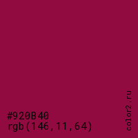Цвет #920B40 в цветовой модели RGB обозначается тремя октетами (146, 11, 64) в десятичном формате и #920B40 в шестнадцатиричном (hex) формате, которые являются интенсивностью красного 146 (hex 92), интенсивность зелёного 11 (hex 0B) и интенсивность синего 64 (hex 40).