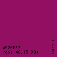 Цвет #920F62 в цветовой модели RGB обозначается тремя октетами (146, 15, 98) в десятичном формате и #920F62 в шестнадцатиричном (hex) формате, которые являются интенсивностью красного 146 (hex 92), интенсивность зелёного 15 (hex 0F) и интенсивность синего 98 (hex 62).