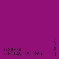 Цвет #920F78 в цветовой модели RGB обозначается тремя октетами (146, 15, 120) в десятичном формате и #920F78 в шестнадцатиричном (hex) формате, которые являются интенсивностью красного 146 (hex 92), интенсивность зелёного 15 (hex 0F) и интенсивность синего 120 (hex 78).