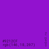 Цвет #9212CF в цветовой модели RGB обозначается тремя октетами (146, 18, 207) в десятичном формате и #9212CF в шестнадцатиричном (hex) формате, которые являются интенсивностью красного 146 (hex 92), интенсивность зелёного 18 (hex 12) и интенсивность синего 207 (hex CF).