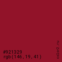 Цвет #921329 в цветовой модели RGB обозначается тремя октетами (146, 19, 41) в десятичном формате и #921329 в шестнадцатиричном (hex) формате, которые являются интенсивностью красного 146 (hex 92), интенсивность зелёного 19 (hex 13) и интенсивность синего 41 (hex 29).