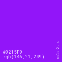 Цвет #9215F9 в цветовой модели RGB обозначается тремя октетами (146, 21, 249) в десятичном формате и #9215F9 в шестнадцатиричном (hex) формате, которые являются интенсивностью красного 146 (hex 92), интенсивность зелёного 21 (hex 15) и интенсивность синего 249 (hex F9).