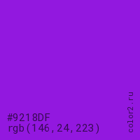 Цвет #9218DF в цветовой модели RGB обозначается тремя октетами (146, 24, 223) в десятичном формате и #9218DF в шестнадцатиричном (hex) формате, которые являются интенсивностью красного 146 (hex 92), интенсивность зелёного 24 (hex 18) и интенсивность синего 223 (hex DF).