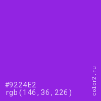 Цвет #9224E2 в цветовой модели RGB обозначается тремя октетами (146, 36, 226) в десятичном формате и #9224E2 в шестнадцатиричном (hex) формате, которые являются интенсивностью красного 146 (hex 92), интенсивность зелёного 36 (hex 24) и интенсивность синего 226 (hex E2).