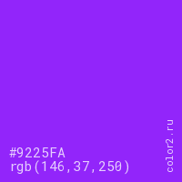 Цвет #9225FA в цветовой модели RGB обозначается тремя октетами (146, 37, 250) в десятичном формате и #9225FA в шестнадцатиричном (hex) формате, которые являются интенсивностью красного 146 (hex 92), интенсивность зелёного 37 (hex 25) и интенсивность синего 250 (hex FA).
