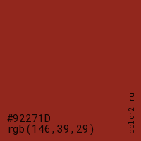 Цвет #92271D в цветовой модели RGB обозначается тремя октетами (146, 39, 29) в десятичном формате и #92271D в шестнадцатиричном (hex) формате, которые являются интенсивностью красного 146 (hex 92), интенсивность зелёного 39 (hex 27) и интенсивность синего 29 (hex 1D).