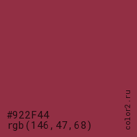 Цвет #922F44 в цветовой модели RGB обозначается тремя октетами (146, 47, 68) в десятичном формате и #922F44 в шестнадцатиричном (hex) формате, которые являются интенсивностью красного 146 (hex 92), интенсивность зелёного 47 (hex 2F) и интенсивность синего 68 (hex 44).