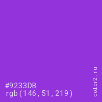 Цвет #9233DB в цветовой модели RGB обозначается тремя октетами (146, 51, 219) в десятичном формате и #9233DB в шестнадцатиричном (hex) формате, которые являются интенсивностью красного 146 (hex 92), интенсивность зелёного 51 (hex 33) и интенсивность синего 219 (hex DB).