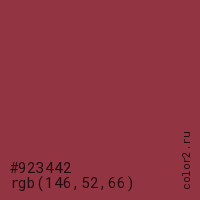 Цвет #923442 в цветовой модели RGB обозначается тремя октетами (146, 52, 66) в десятичном формате и #923442 в шестнадцатиричном (hex) формате, которые являются интенсивностью красного 146 (hex 92), интенсивность зелёного 52 (hex 34) и интенсивность синего 66 (hex 42).