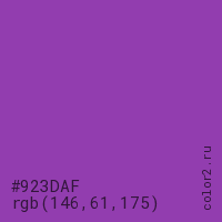 Цвет #923DAF в цветовой модели RGB обозначается тремя октетами (146, 61, 175) в десятичном формате и #923DAF в шестнадцатиричном (hex) формате, которые являются интенсивностью красного 146 (hex 92), интенсивность зелёного 61 (hex 3D) и интенсивность синего 175 (hex AF).