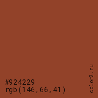 Цвет #924229 в цветовой модели RGB обозначается тремя октетами (146, 66, 41) в десятичном формате и #924229 в шестнадцатиричном (hex) формате, которые являются интенсивностью красного 146 (hex 92), интенсивность зелёного 66 (hex 42) и интенсивность синего 41 (hex 29).